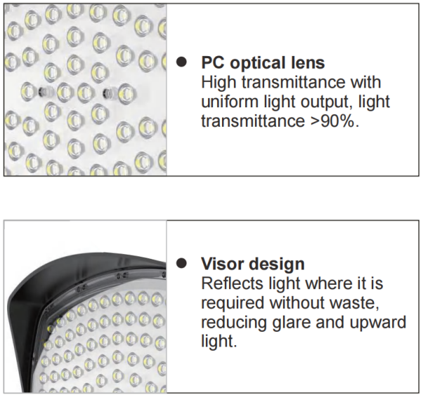 Visor design direct light primarily toward the court, reducing spillover toward the stands and sky. The material uses a matte aluminum surface with a black light-absorbing coating to reduce stray light reflections.