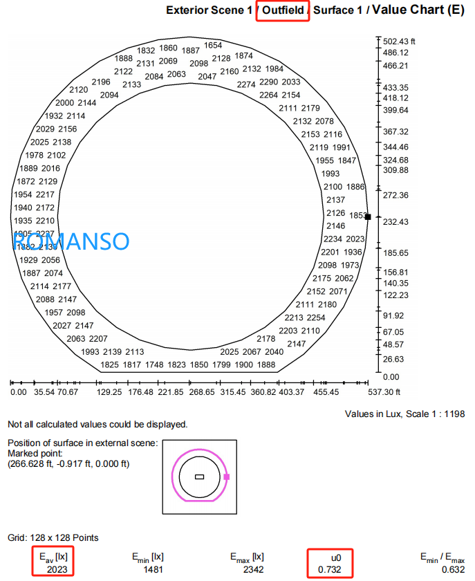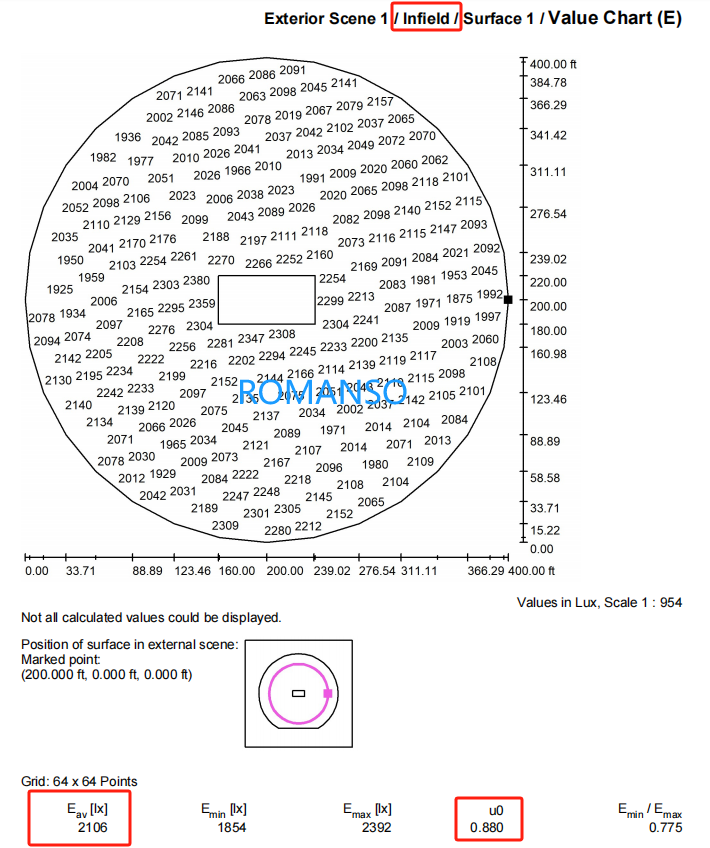 4. Horizontal Illuminance: 2369lux (Pitch/Square area), 2106lux (Infield), 2023lux (Outfield)